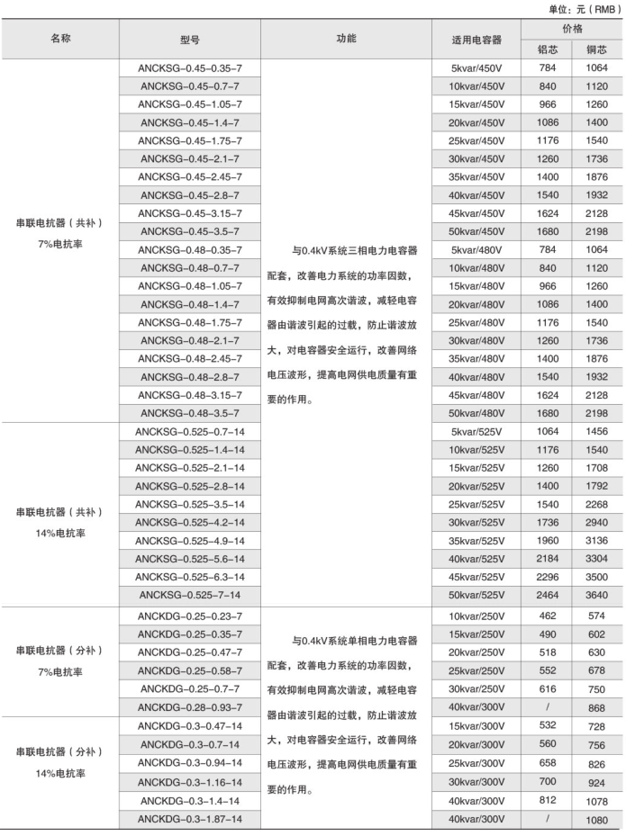 ANCK系列串聯電抗器與ANBSMJ系列自愈式低壓并聯電容器配套使用,主要用于提高0.4kV電力系統的功率因數,有效抑制電網的高次諧波,減輕電容器由諧波引起的過載,防止諧波放大,對電容器的安全運行,改善網絡電壓波形,提高供電質量和電網安全經濟運行起良好作用。應用范圍:
