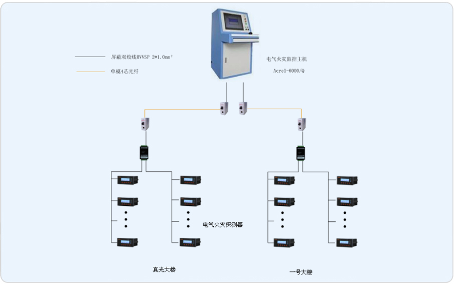 本期工程的監(jiān)控范圍主要為真光廣學(xué)大樓及新建一號樓,新建一號樓47個漏電流監(jiān)控裝置分布在B1~8F中,真光大樓33個漏電流監(jiān)控裝置分布在B1F~9F中,現(xiàn)為本項目設(shè)計一套Acrel-6000電氣火災(zāi)監(jiān)控系統(tǒng),監(jiān)控裝置通過集線器及光纖至電氣火災(zāi)監(jiān)控裝置,并由此來實時監(jiān)測商業(yè)樓內(nèi)重要回路的漏電流,以確保商業(yè)區(qū)配電系統(tǒng)的電氣安全。