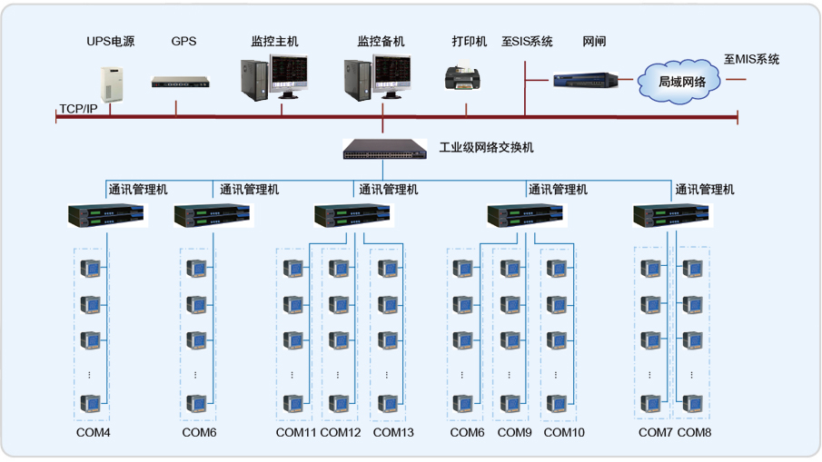 為了能實(shí)現(xiàn)對(duì)電廠電能量數(shù)據(jù)進(jìn)行自動(dòng)采集、遠(yuǎn)傳和存儲(chǔ)、預(yù)處理、線損統(tǒng)計(jì)及分析的電能綜合管理平臺(tái),合肥電廠電能量管理系統(tǒng)采用了Acrel-3000電能管理軟件,通過(guò)現(xiàn)場(chǎng)總線把現(xiàn)場(chǎng)的電能儀表進(jìn)行集中管理,做到了自動(dòng)采集、集中控制、智能管理。同時(shí)本電能管理系統(tǒng)還具備同廠內(nèi)SIS(監(jiān)控信息系統(tǒng))以及MIS(管理信息系統(tǒng))共享。