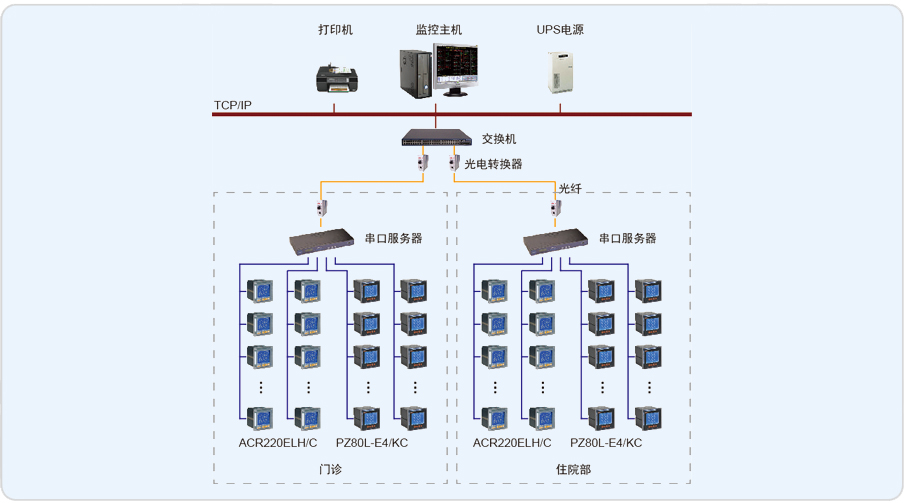 整個系統采用網絡分布式結構,監控主機位于報告廳和外科樓的地下一層的動力中心中。該項目實現了哈醫大一院2個樓內遠程精細化及時性報警。設計方案為2個樓內的2個配電室,儀表數據通過485接口,MODBUS通訊協議經數據采集器輸送到值班室主機。