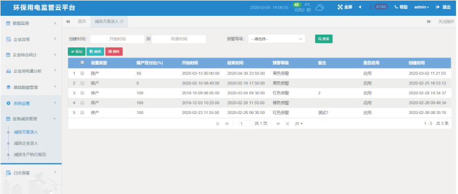 減排方案錄入:根據減排計劃錄入減排方案,支持應急預案的啟動。