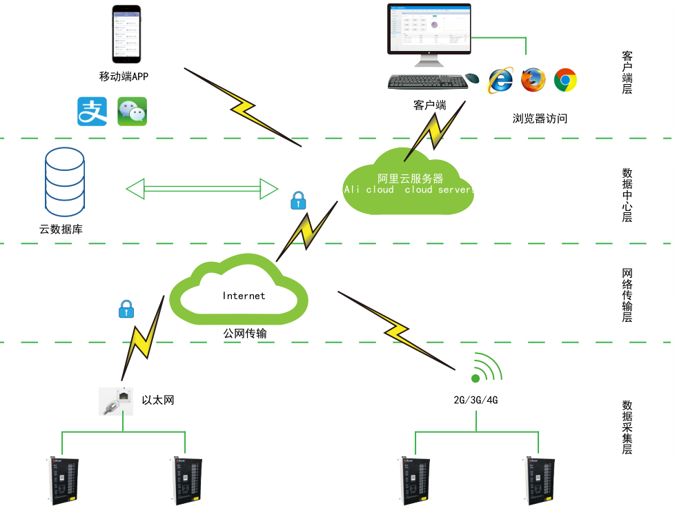 安科瑞電瓶車充電樁通過GPRS模塊與云端進(jìn)行通信和數(shù)據(jù)交互。系統(tǒng)能夠?qū)﹄娖寇嚦潆姌兜娜粘顟B(tài)、充電過程進(jìn)行監(jiān)控;實(shí)現(xiàn)充電支付對(duì)接:支持投幣、刷卡、微信支付等多種支付方式,保證支付交易過程的完整性,對(duì)充電過程中的異常情況進(jìn)行有效預(yù)警;實(shí)現(xiàn)對(duì)下游站級(jí)平臺(tái)的清算、對(duì)賬功能。